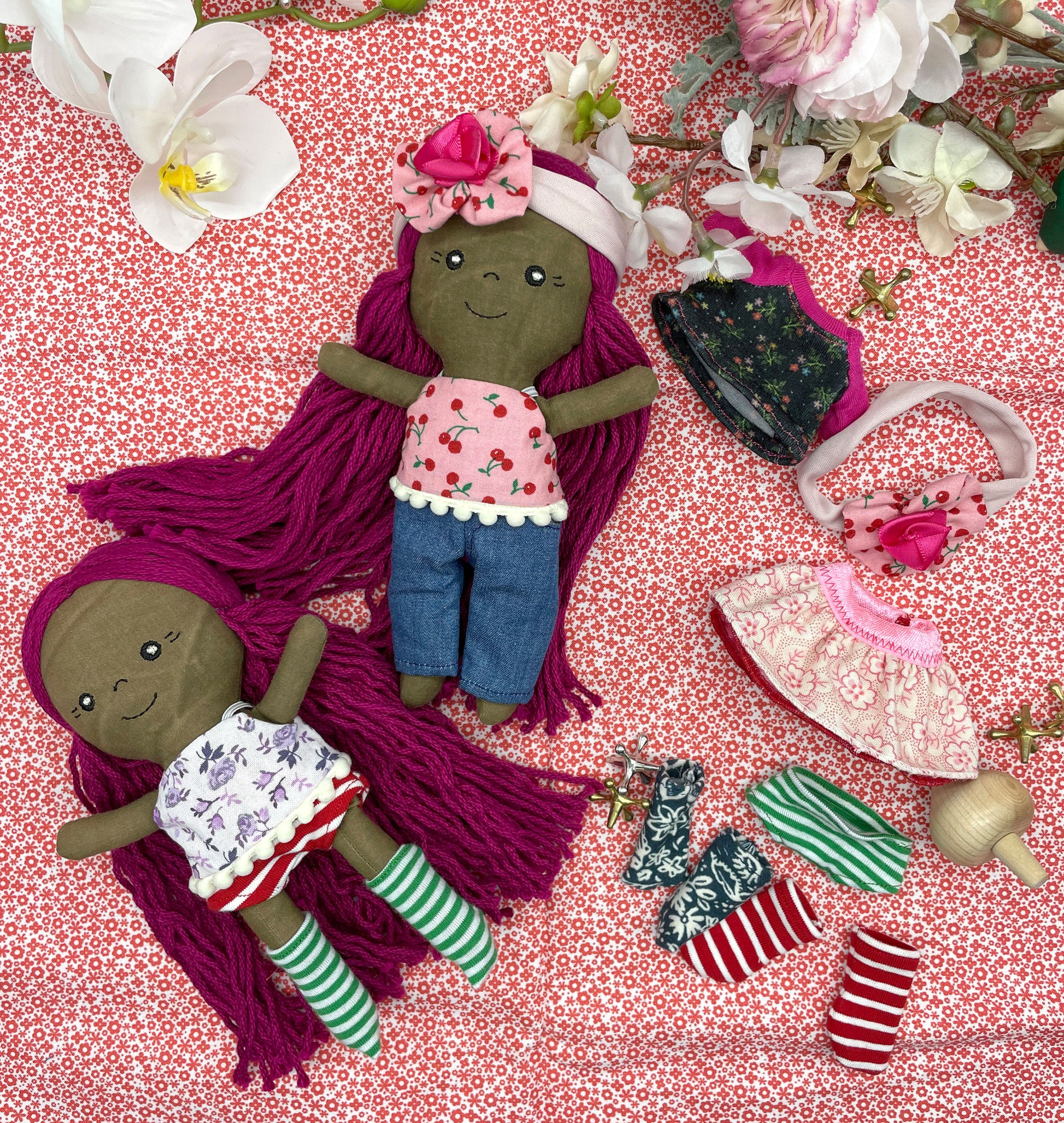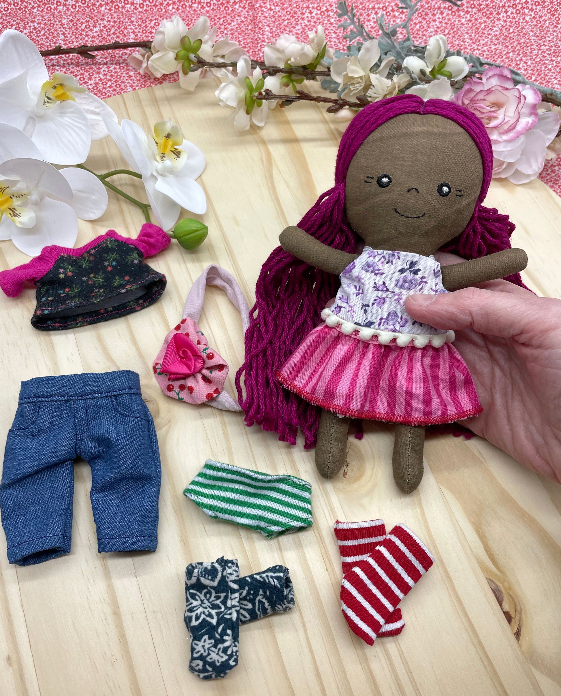 Small Handmade Doll with extra clothes, handmade, Pink hair, Accessories included, Gift Doll, Diverse, heirloom, doll set, skirt, reversible